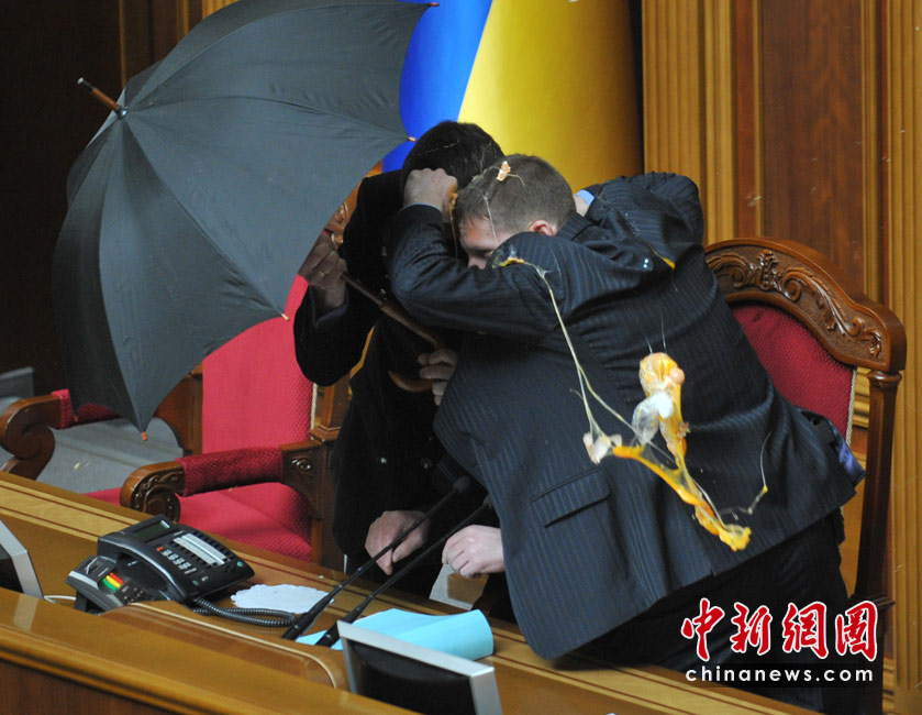 烏克蘭議會(huì)發(fā)生騷亂 議長(zhǎng)傘后躲雞蛋