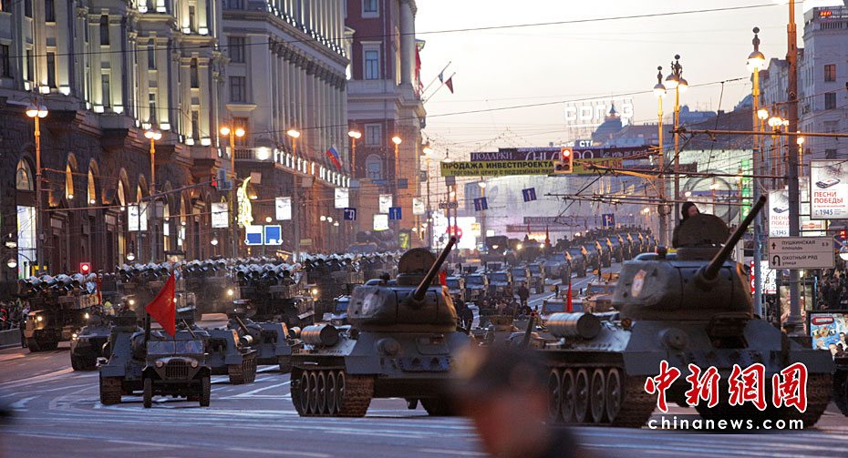 此次紅場閱兵包括兩部分內(nèi)容:歷史部分和現(xiàn)代部分。歷史部分由身穿衛(wèi)國戰(zhàn)爭時期軍服的士兵在鵝卵石道上進行,同時還會有9輛T-34坦克和8輛SU-100自行火炮,F(xiàn)代部分由13輛老虎裝甲車、BTR-80裝甲車、BMP-3步兵戰(zhàn)車、T-90A坦克和S-400防空系統(tǒng)等。圖片來源:中國新聞網(wǎng)