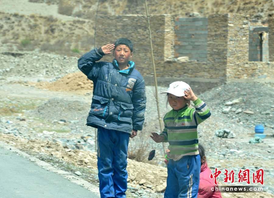 各地赴青海地震救援隊(duì)伍4月底前陸續(xù)撤回,玉樹(shù)通往西寧的214國(guó)道路邊,經(jīng)常可見(jiàn)有小學(xué)生向回撤的抗震救災(zāi)車(chē)隊(duì)人員舉手致敬。中新社發(fā) 賈國(guó)榮 攝