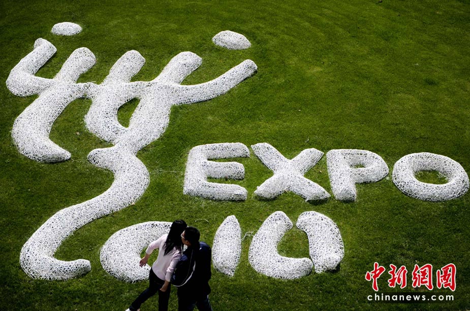4月29日,上海靜安區(qū)草坪上的世博會(huì)會(huì)徽和一對(duì)情侶。世博會(huì)開幕前,面臨“大考”的上海充滿喜慶氣氛。 中新社發(fā) 廖攀 攝