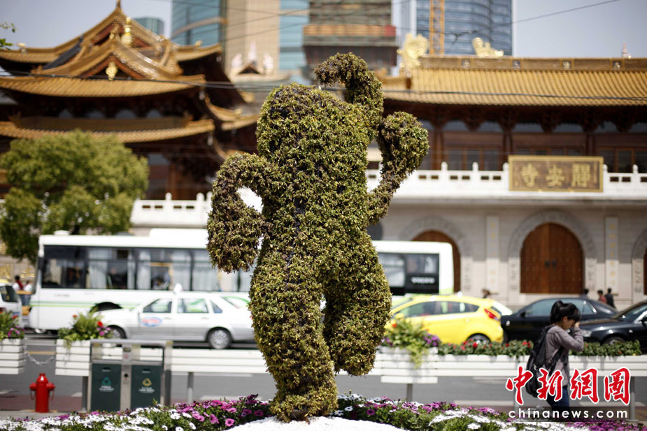4月29日,上海靜安寺前的海寶造型花壇。世博會開幕前,面臨“大考”的上海充滿喜慶氣氛。中新社發(fā) 盛佳鵬 攝