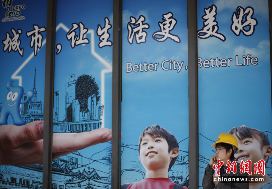 4月29日,上海一名建筑工人站在世博會(huì)宣傳海報(bào)前。世博會(huì)開幕在即,面臨“大考”的上海充滿喜慶氣氛。中新社發(fā) 盛佳鵬 攝