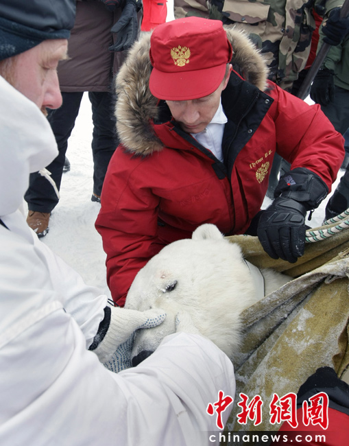4月29日,俄羅斯總理普京參觀亞歷山大地島(法蘭士約瑟夫地群島)。 普京還與在研究學(xué)者一同給通過(guò)專門的陷阱捕獲的北極熊戴上衛(wèi)星定位項(xiàng)圈。此外,學(xué)者們還與普京一起給北極熊進(jìn)行測(cè)量和秤體重,