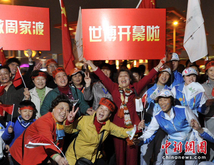 30日晚上8時(shí),2010年上海世博會正式拉開帷幕。上海周家渡動遷居民和志愿者在中國館前打出“世博開幕啦”的大牌子,高喊:“世博開幕啦!我們開心死啦!”中新網(wǎng)記者 王紅綱 攝