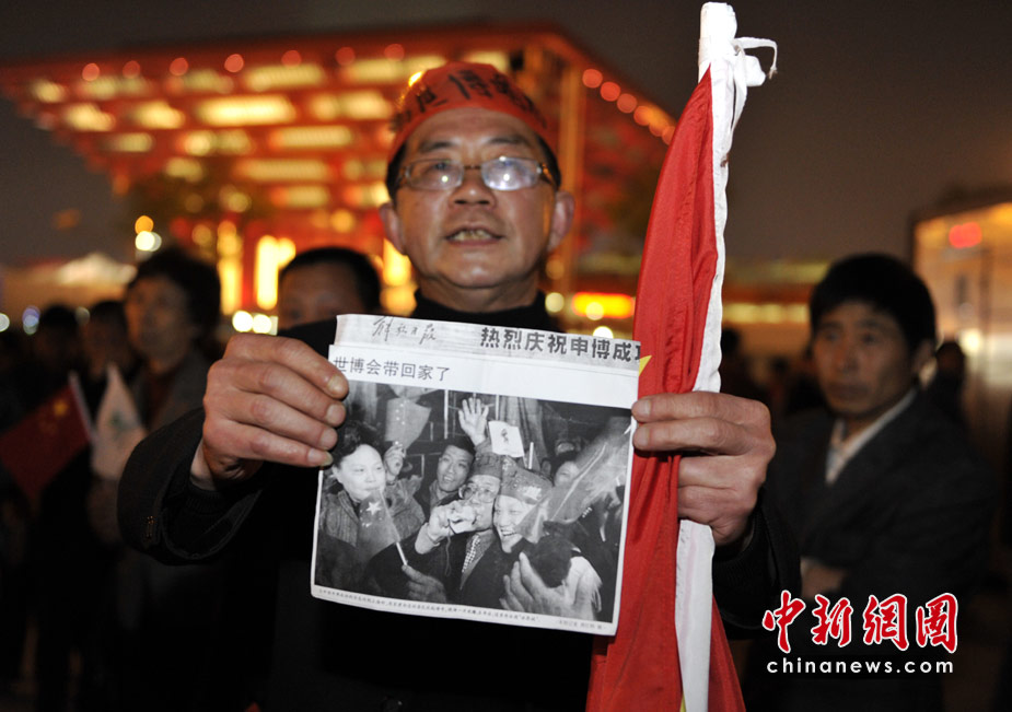 30日晚上8時(shí),2010年上海世博會(huì)正式拉開帷幕。60多歲的俞大爺頭上戴著寫有“為世博喝彩!”的頭箍。他告訴記者,8年前,世博申辦成功的時(shí)候,他也曾經(jīng)戴過(guò)這樣一個(gè)頭箍,上面寫著“我們成功了!”圖為俞大爺展示8年前申博成功時(shí)報(bào)紙上登的他的照片。中新網(wǎng)記者 王紅綱 攝