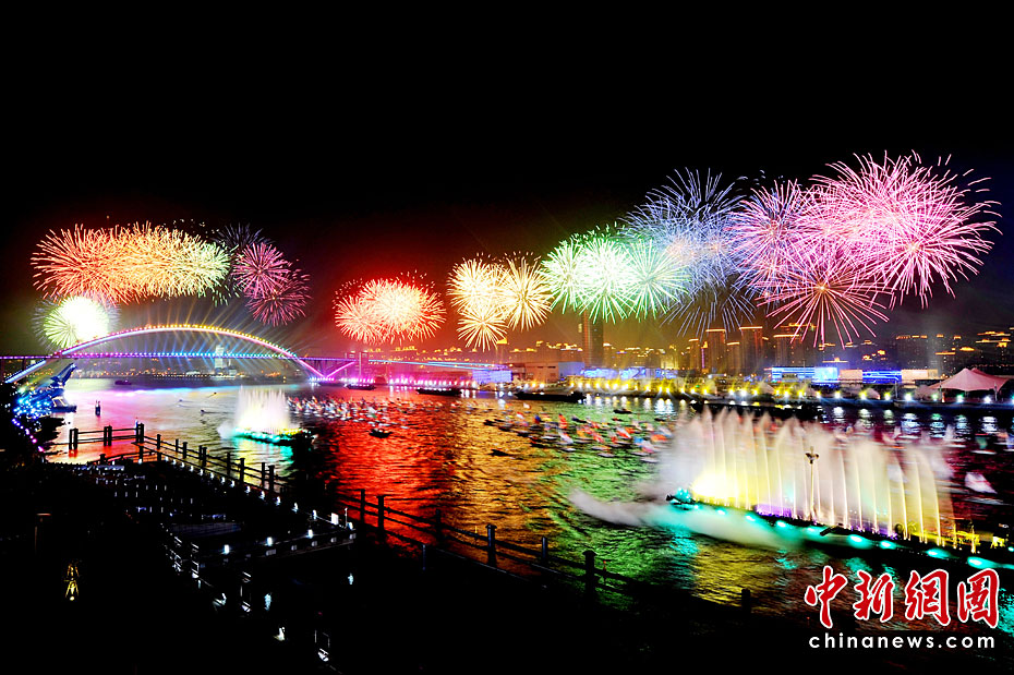4月30日晚21時(shí)28分,在世博會(huì)焰火燈光表演開(kāi)始。萬(wàn)千煙花爭(zhēng)奇斗妍,黃浦江兩岸綿延3.28公里同時(shí)奏響火樹(shù)銀花不夜天的華彩世博樂(lè)章。圖片來(lái)源:中國(guó)新聞網(wǎng)