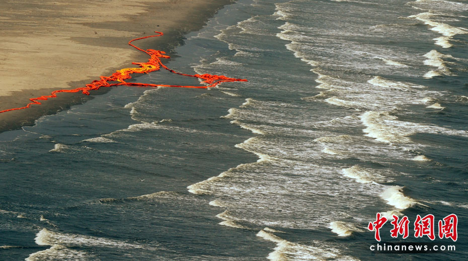 4月30日,在美國路易斯安那州海岸,為阻隔原油擴散而設(shè)的護欄帶被海風浪沖到岸邊。當天,美國總統(tǒng)奧巴馬下令調(diào)查墨西哥灣石油鉆井平臺爆炸事件,以避免將來類似事件再次發(fā)生。平臺爆炸沉沒后泄漏的原油當天已漂至美國沿岸。圖片來源:中國新聞網(wǎng)