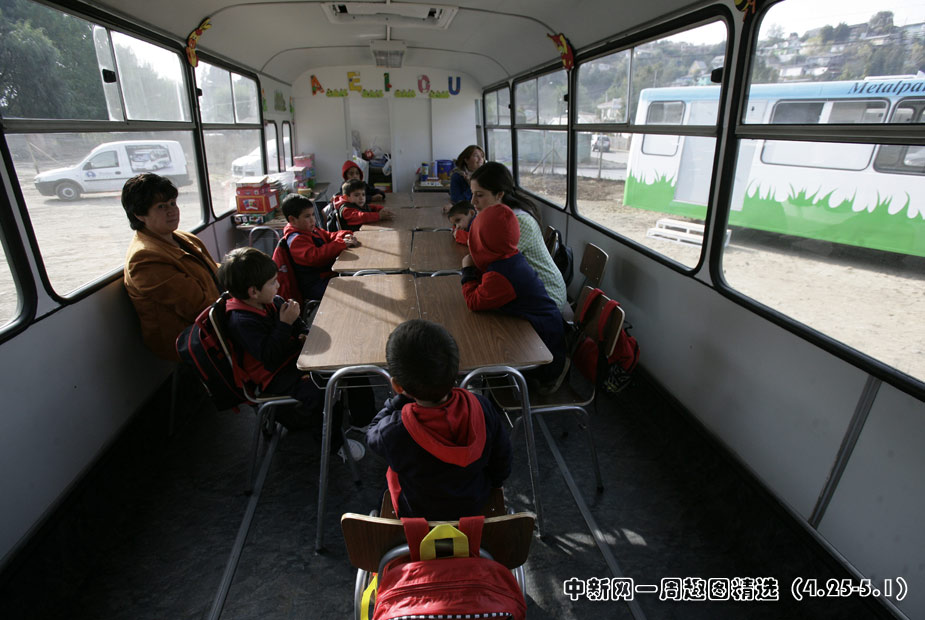 4月26日,今年2月遭受8.8級強烈地震的智利康塞普西翁市,兒童們在“巴士學(xué)!崩锷险n。圖片來源:中國新聞網(wǎng)>>點擊觀看詳細(xì)內(nèi)容