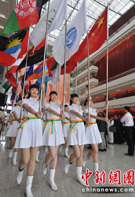 5月1日,上海世博會舉行開園儀式,美女旗手高舉參展國家和地區(qū)、組織的旗幟入場。中新社發(fā) 賈國榮 攝