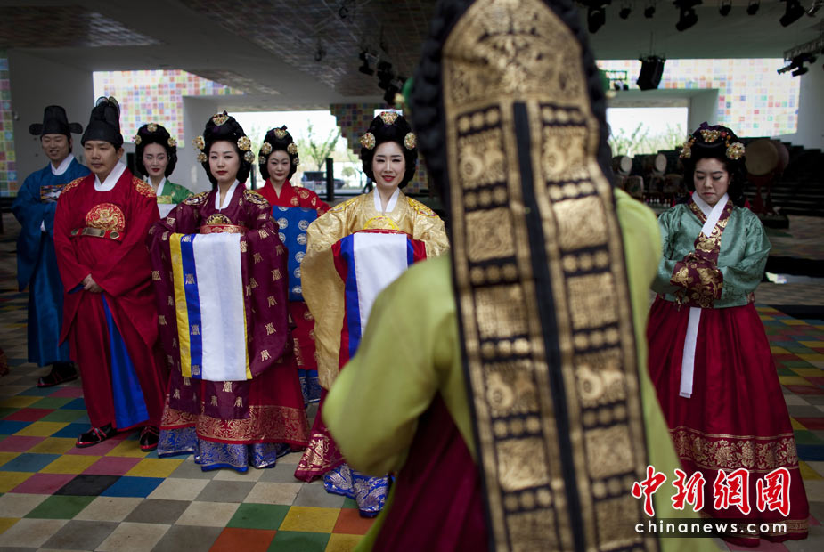 5月1日,上海世博會(huì)正式開園迎客,首批游客入園參觀。圖為在韓國館內(nèi)接待人員靜候前來參觀的游客。