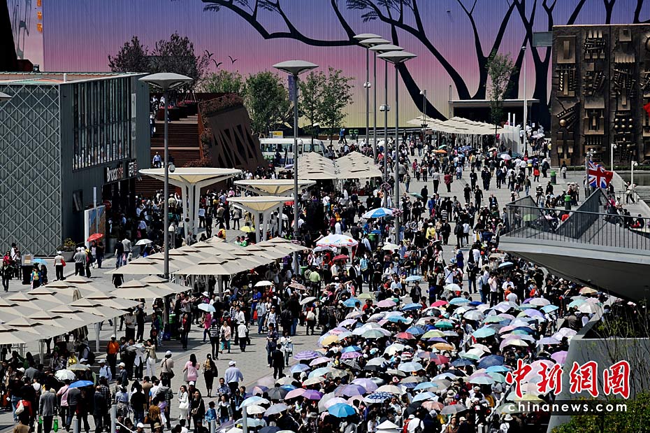 5月1日,2010上海世博園正式開園第一天,參觀者從浦東、浦西10多個(gè)出入口進(jìn)入園區(qū),世博園區(qū)內(nèi)游人如潮。圖片來源:中國新聞網(wǎng)