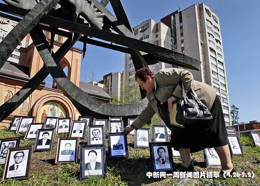 26日(周一),一名婦女在基輔紀(jì)念切爾諾貝利爆炸中死亡的丈夫。當(dāng)日烏克蘭等國紀(jì)念切爾諾貝利核泄漏事故24周年。