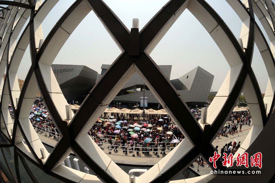 5月2日,上海世博園開(kāi)園第二天迎來(lái)客流高峰。在正午的陽(yáng)光下,從法國(guó)館的藝術(shù)格柵中眺望德國(guó)館,別有一番景觀。 中新社發(fā) 廖攀 攝
