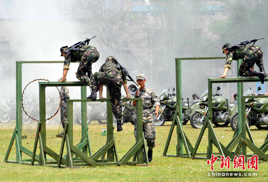 為慶祝“五一”國際勞動(dòng)節(jié),進(jìn)一步增進(jìn)與香港社會(huì)各界相互溝通與交流,中國人民解放軍駐香港部隊(duì)5月2日開放了石崗軍營。圖為駐港部隊(duì)精彩的表演。 中新社發(fā) 鄧慶樂 攝