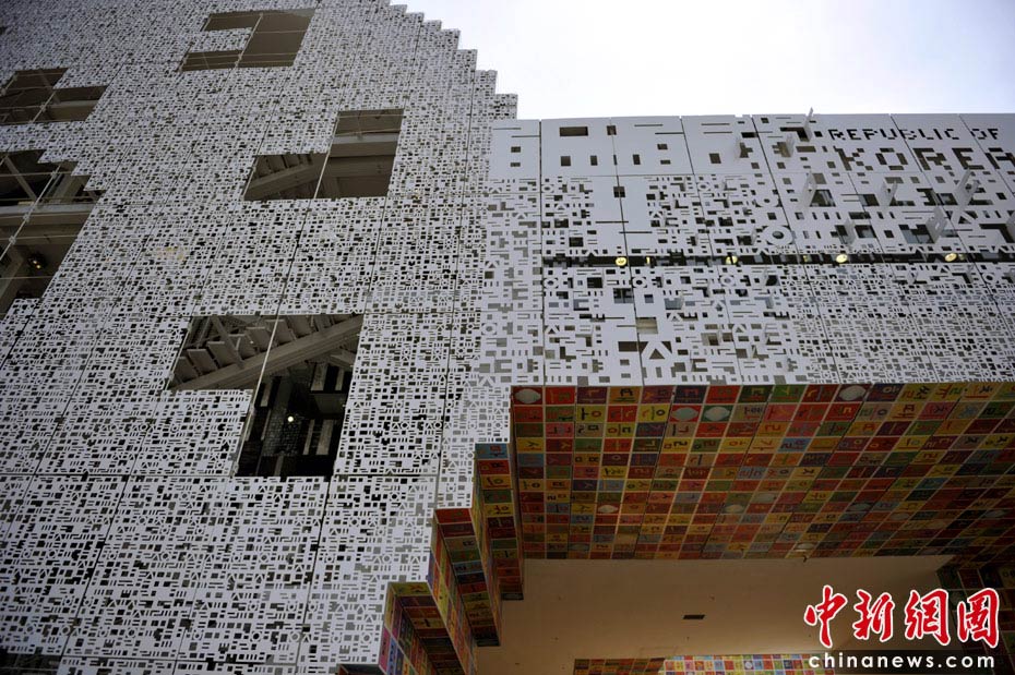 韓國(guó)館是由韓文來(lái)“建造”的,遠(yuǎn)觀展館,由幾個(gè)碩大的韓文字母連接而成;近看外墻,則為無(wú)數(shù)凹凸有致的韓文字母。中新網(wǎng)記者 王紅綱 攝
