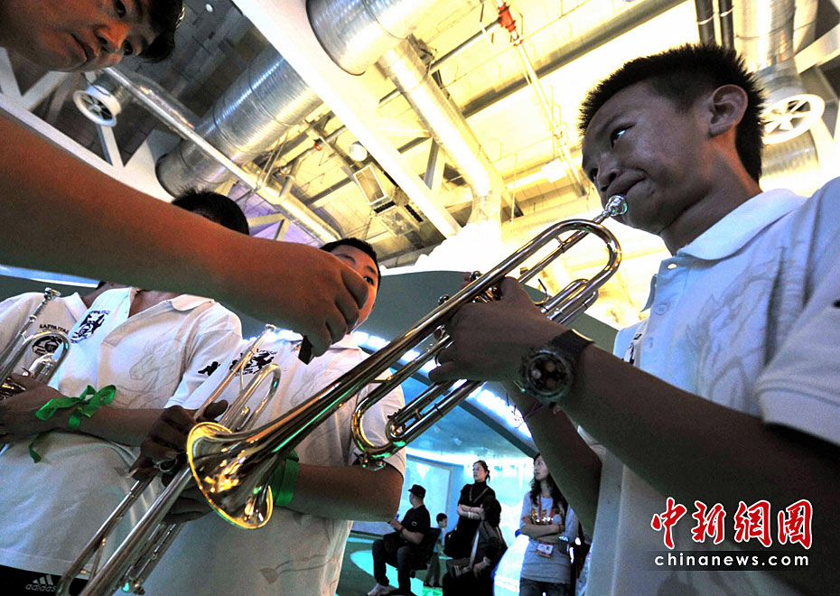 5月2日清晨,來自玉樹地震災(zāi)區(qū)結(jié)古鎮(zhèn)的藏族小樂手巴東珠,含著姐姐在地震中不幸遇難的悲痛心情,與小白楊中學(xué)生管弦樂團(tuán)來到上海世博會(huì),為中國青海館觀眾獻(xiàn)上一曲《在那遙遠(yuǎn)的地方》。他悲歡交融的情懷和演藝,感動(dòng)全場。巴東珠之前還是青海省人民醫(yī)院為地震傷員做藏語翻譯的志愿者。中新社記者 賈國榮 攝