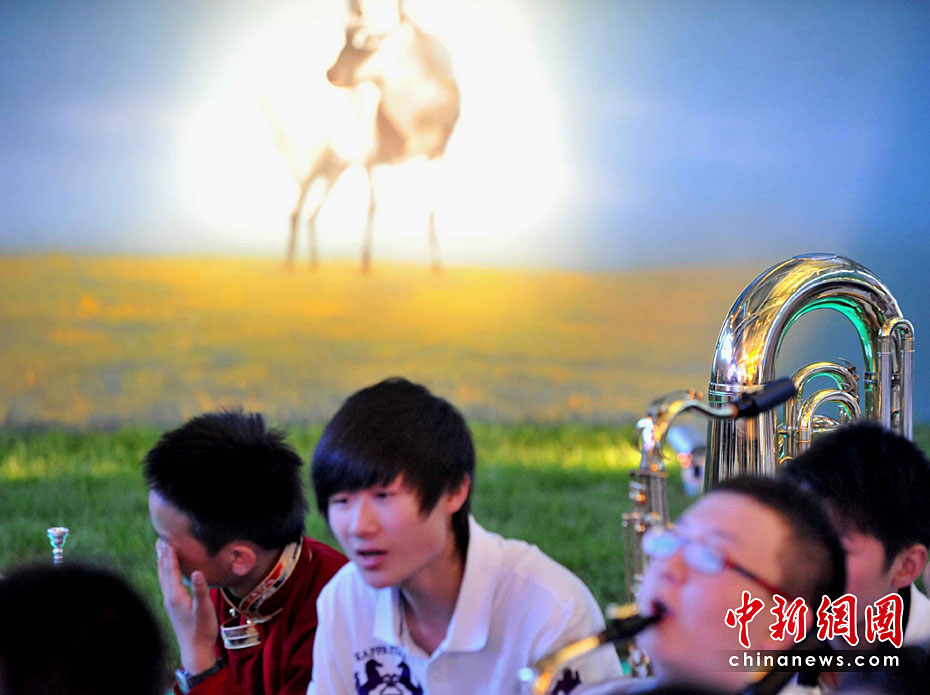 5月2日清晨,來自玉樹地震災區(qū)結(jié)古鎮(zhèn)的藏族小樂手巴東珠,含著姐姐在地震中不幸遇難的悲痛心情,與小白楊中學生管弦樂團來到上海世博會,為中國青海館觀眾獻上一曲《在那遙遠的地方》。他悲歡交融的情懷和演藝,感動全場。巴東珠之前還是青海省人民醫(yī)院為地震傷員做藏語翻譯的志愿者。中新社記者 賈國榮 攝