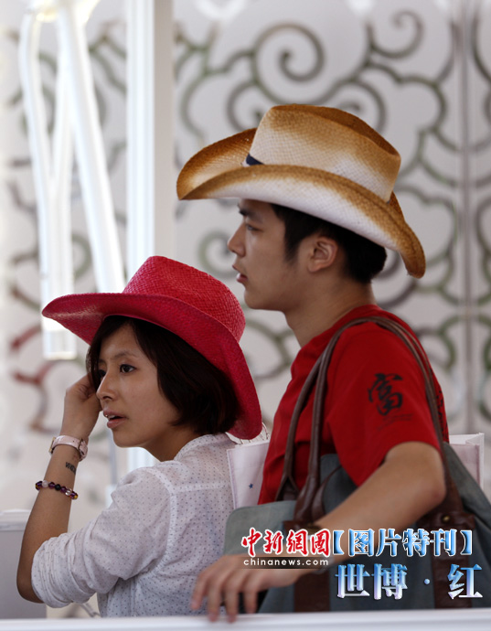 紅色象征著熱量與活力,紅色也象征著興奮與激情,在世博園區(qū)內(nèi)游覽,總會有一抹濃艷的紅色闖入到記者鏡頭之中,讓世博變得更加火辣。圖為著裝時尚的游客。中新社記者 盛佳鵬 攝