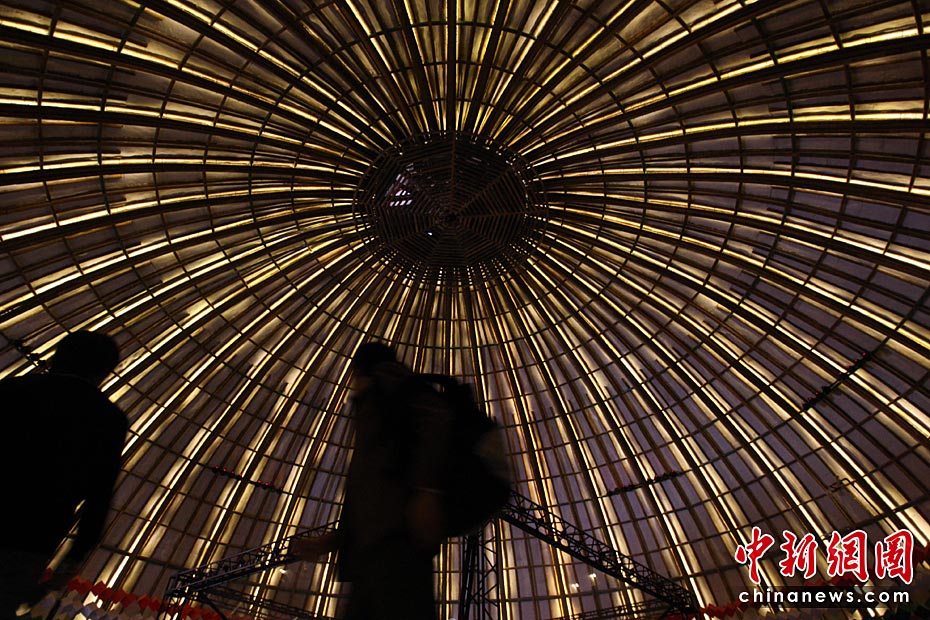 5月2日,上海世博會是第一個(gè)正式提出“低碳世博”理念的世博會,圍繞著這樣的理念,上海世博園區(qū)內(nèi)的低碳元素比比皆是。圖為印度館內(nèi)竹制的世界最大穹頂,這個(gè)竹制穹頂上方是小型風(fēng)力發(fā)電裝置和太陽能電池板,為整個(gè)場館提供綠色清潔能源。中新社發(fā) 湯彥俊 攝