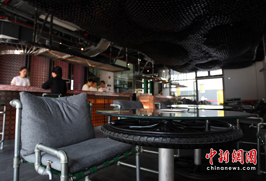 5月2日,上海世博會是第一個正式提出“低碳世博”理念的世博會,圍繞著這樣的理念,上海世博園區(qū)內(nèi)的低碳元素比比皆是。圖為世博倫敦零碳館內(nèi)由廢舊輪胎、水管、瓶子組成的“零碳酒吧”。中新社發(fā) 湯彥俊 攝