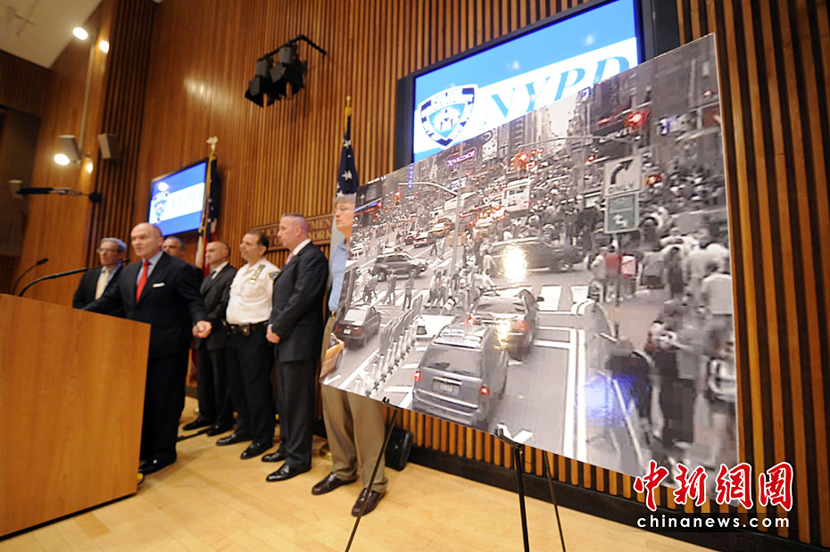 美國當(dāng)?shù)貢r(shí)間5月2日,紐約市警察局長凱利在記者會(huì)上公布了紐約時(shí)代廣場(chǎng)爆炸事件現(xiàn)場(chǎng)照片。同時(shí)他還指出,沒有證據(jù)顯示巴基斯坦塔利班策劃了1日傍晚發(fā)生在紐約時(shí)報(bào)廣場(chǎng)上的未遂汽車炸彈襲擊事件。圖片來源:中國新聞網(wǎng)