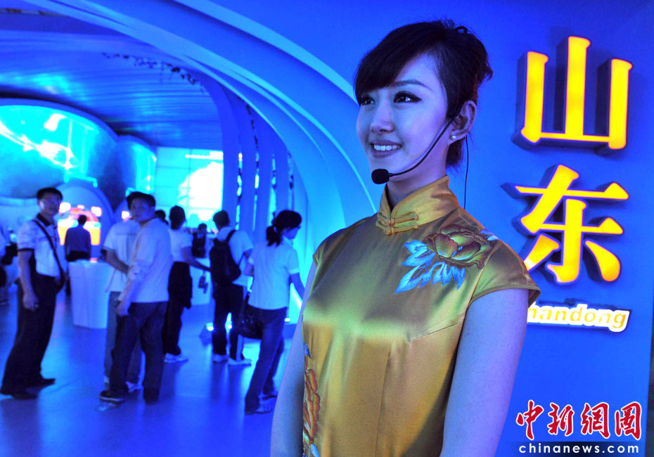 5月3日,上海世博會中國山東館一位禮儀小姐始終笑容可掬,許多參觀者都喜歡與外秀內(nèi)慧的她拍一張留影照。當(dāng)一對夫婦推著嬰兒車經(jīng)過時(shí),她迅速上前幫助抬下階梯。她因而享有全場最善解人意的禮儀小姐美稱。中新社發(fā) 賈國榮 攝