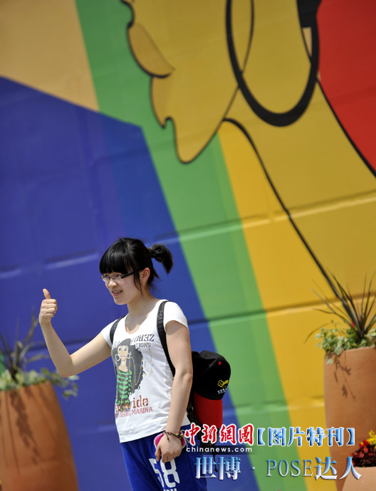 逛世博一定會(huì)拍照留念,擺一個(gè)漂亮有創(chuàng)意的pose尤為重要。面對(duì)著鏡頭,挺胸收腹翹臀,一個(gè)微笑,一個(gè)手勢(shì),秀出自己的活力。心中一定要默念:“我留下的不是照片,是心情!”非洲聯(lián)合館前,一個(gè)女?dāng)[出“我最棒”的經(jīng)典pose。中新網(wǎng)記者 王紅綱 攝