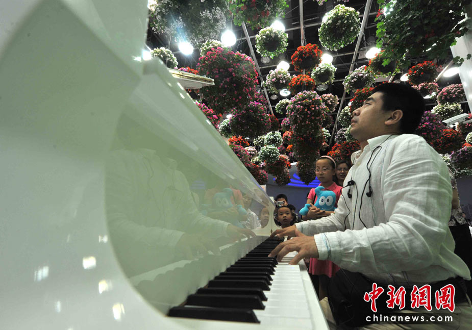 5月4日是上海世博會第四天,盲人鋼琴家孫巖在生命陽光館專設(shè)區(qū)域為眾多殘疾人和觀眾演奏,導(dǎo)盲犬靜臥在他的腳邊,這是世博會歷史上第一次為殘疾人設(shè)館。孫巖2005年獲得“日本橫濱第一屆國際殘疾人鋼琴比賽”金獎,他是中央音樂學(xué)院有史以來第一位盲人大學(xué)生和研究生。他的傾情演奏感動全場,掌聲連連。中新社發(fā) 賈國榮 攝