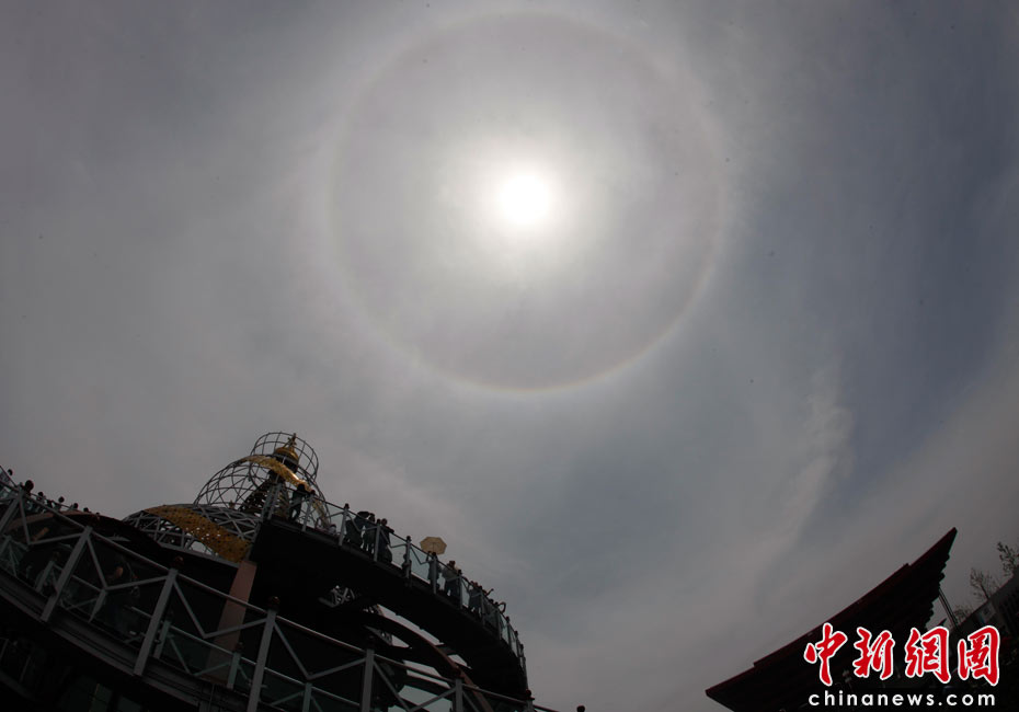 2010年5月4日,上海世博園區(qū)上空出現(xiàn)日暈,與中國(guó)國(guó)家館和尼泊爾館相映成趣。中新社發(fā) 盛佳鵬 攝