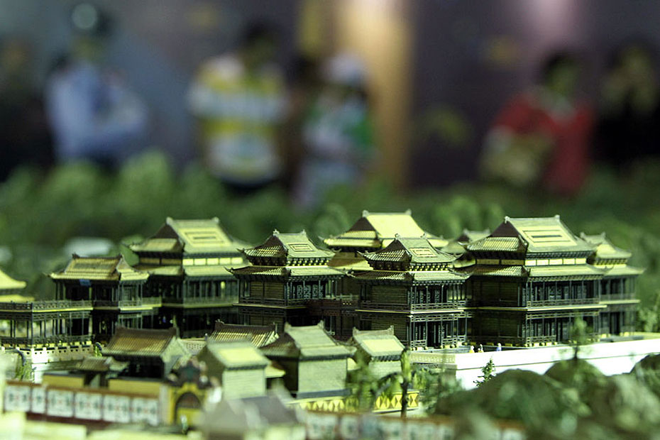 5月4日,游客在參觀縮微版“圓明園”。近日,一座“全景式巨型立雕圓明園”在上海世博會(huì)世界貿(mào)易中心協(xié)會(huì)館亮相。這座縮微版的“圓明園”以1比150的比例制作而成,再現(xiàn)了全盛時(shí)期的圓明園雄偉壯觀的全景。圖片來源:新華網(wǎng) 裴鑫 攝