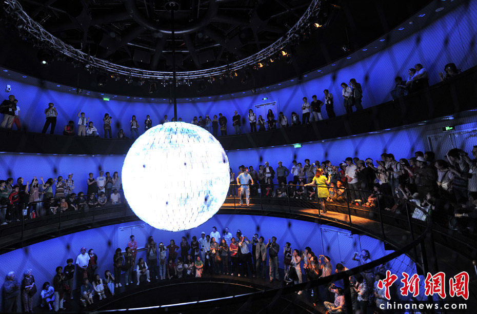 德國(guó)館的高潮就是它的最后部分“動(dòng)力之源”。可以容納600人的動(dòng)力之源大廳圓形環(huán)廊是一個(gè)圓錐形空間,中間懸掛著一個(gè)重達(dá)1.5噸、直徑達(dá)3米的巨大金屬球,四周則有一圈供游客駐足的走廊。黑漆漆的大廳里,兩個(gè)虛擬主持人邀請(qǐng)觀眾同時(shí)大聲吶喊。隨著吶喊聲的加大,動(dòng)力球慢慢擺動(dòng)起來,聲音越大擺動(dòng)幅度越大,甚至繞圈飛行。圓球表面40萬(wàn)根發(fā)光的LED管,逐漸閃現(xiàn)出德國(guó)人對(duì)未來城市生活的暢想畫面。這是一場(chǎng)7分鐘的互動(dòng)體驗(yàn)。在這里觀眾才是主角。中新網(wǎng)記者 王紅綱 攝