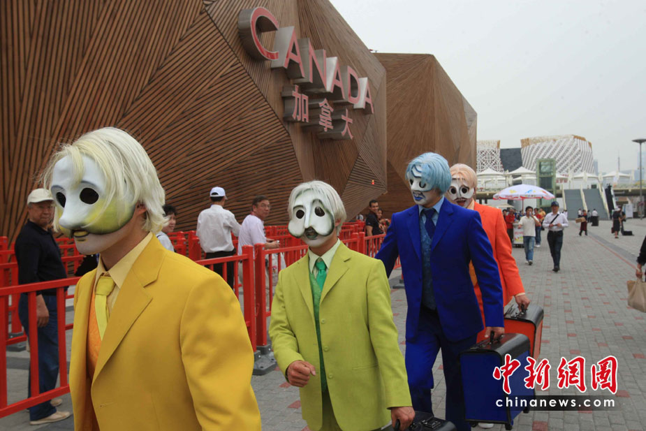 5月6日,幾位穿著艷麗服裝的“藝術(shù)家”,走進世博會加拿大館,這是加拿大館的文化推廣內(nèi)容之一。中新社發(fā) 潘索菲 攝