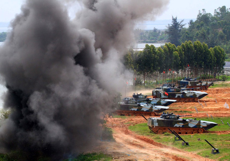 登陸作戰(zhàn)實兵實彈演練。圖片來源:新華網(wǎng) 查春明攝