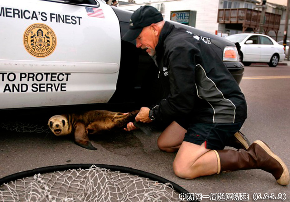 5月5日,在加利福尼亞州,動(dòng)物護(hù)理專家羅賓森把一頭小海豹從圣地亞哥警車下拖出。小海豹之前在另一輛車下被發(fā)現(xiàn),看到警察要捉它就躲到了這輛警車下。圖片來(lái)源:中國(guó)新聞網(wǎng)>>點(diǎn)擊觀看詳細(xì)內(nèi)容
