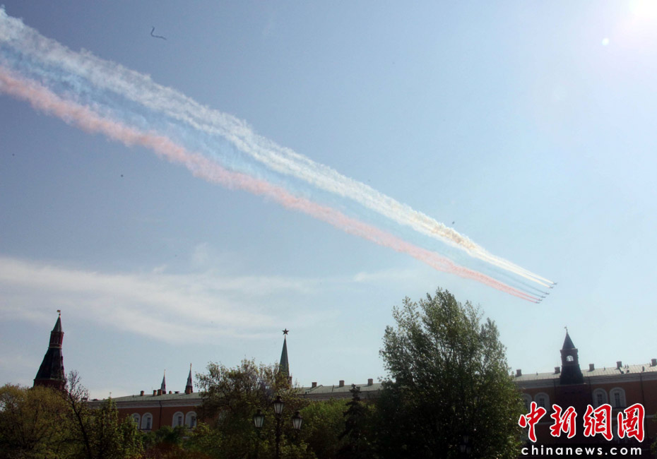 5月9日,俄羅斯在莫斯科紅場舉行盛大的閱兵式,慶祝衛(wèi)國戰(zhàn)爭勝利65周年。莫斯科時間5月9日上午10點(北京時間9日下午2點)許,閱兵式正式開始。圖為最后一個接受檢閱的空中梯隊飛越紅場上空。中新網(wǎng)記者 張朔 攝
