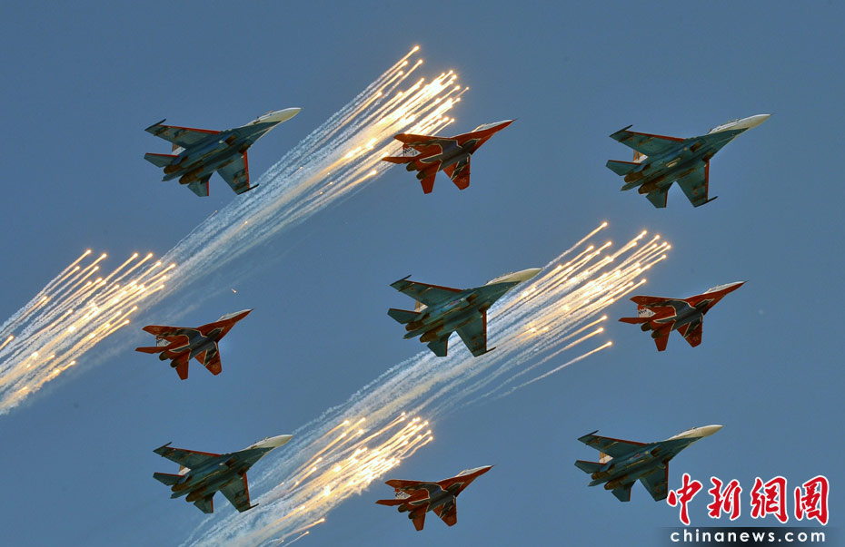 5月9日,俄羅斯在莫斯科紅場(chǎng)舉行盛大的閱兵式,慶祝衛(wèi)國(guó)戰(zhàn)爭(zhēng)勝利65周年。莫斯科時(shí)間5月9日上午10點(diǎn)(北京時(shí)間9日下午2點(diǎn))許,閱兵式正式開(kāi)始。圖為空中梯隊(duì)飛越紅場(chǎng)上空。