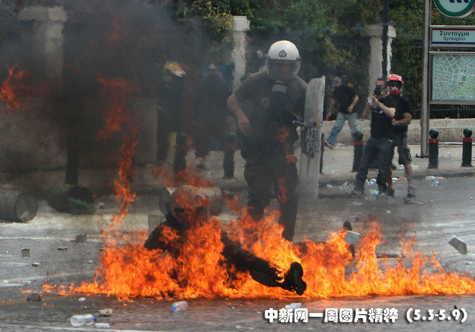 5月5日周三,在雅典舉行的反對大幅削減開支的抗議活動中, 一名防暴警察被困在火焰彈引發(fā)的團團火焰中。