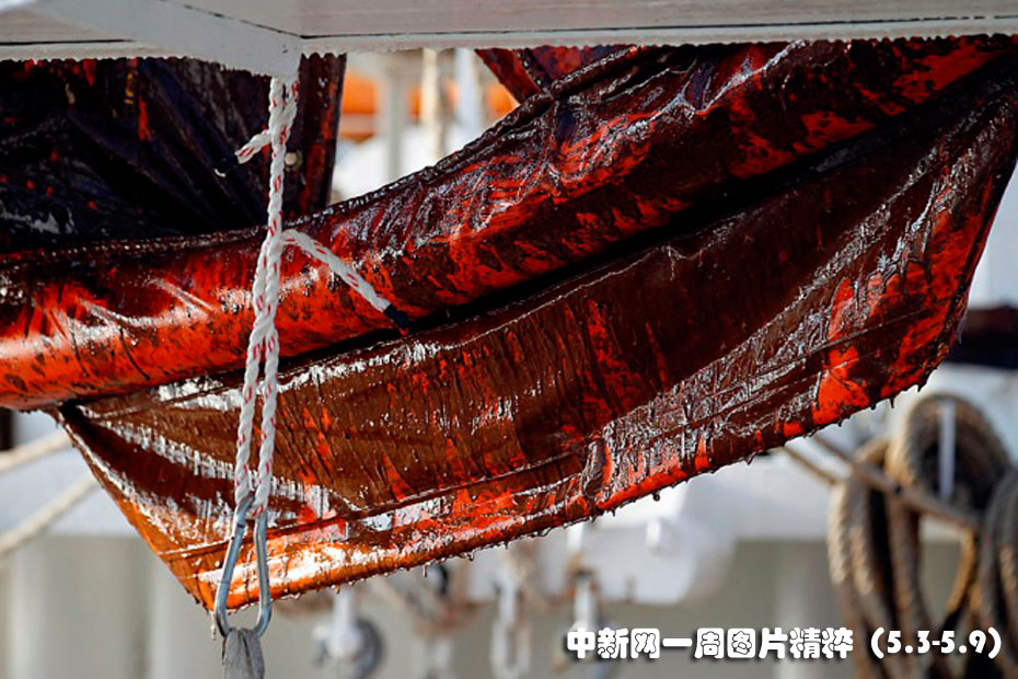 5月6日周四,在路易斯安那州Breton Sound,被石油浸過的帆掛在一艘捕蝦船上。工人們周四打算將一個(gè)100噸的鋼筋水泥罩放入海底,希望以此封堵墨西哥灣油井的大部分石油泄漏。