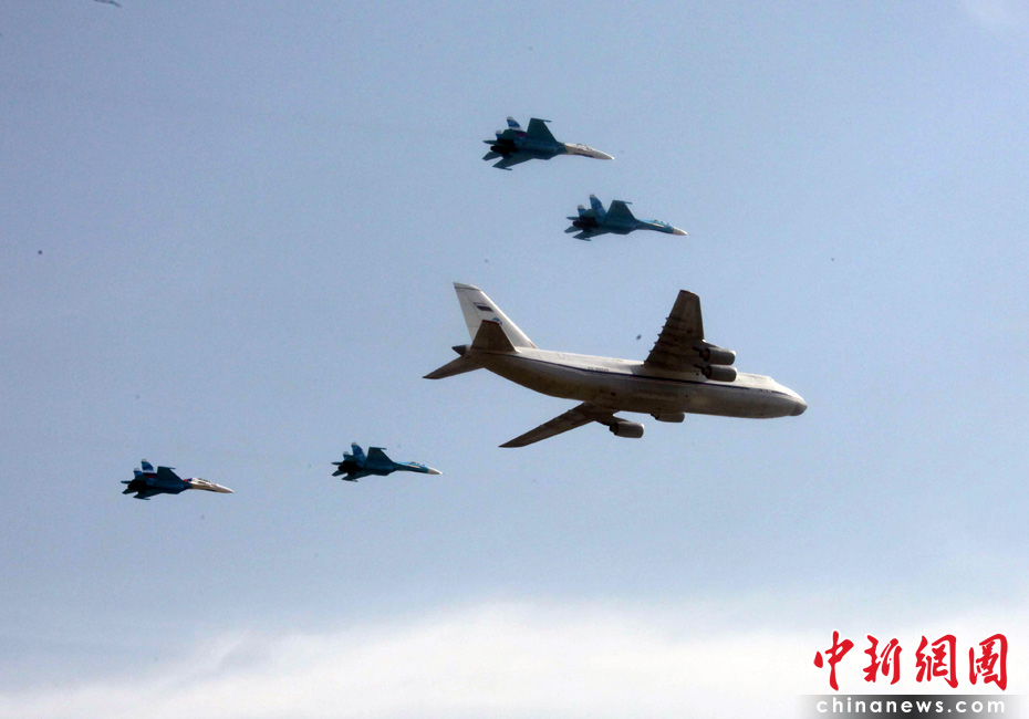 5月9日,俄羅斯在莫斯科紅場(chǎng)舉行盛大的閱兵式,慶祝衛(wèi)國戰(zhàn)爭(zhēng)勝利65周年。莫斯科時(shí)間5月9日上午10點(diǎn)(北京時(shí)間9日下午2點(diǎn))許,閱兵式正式開始。圖為空中梯隊(duì)穿越紅場(chǎng)上空接受檢閱。張朔 攝