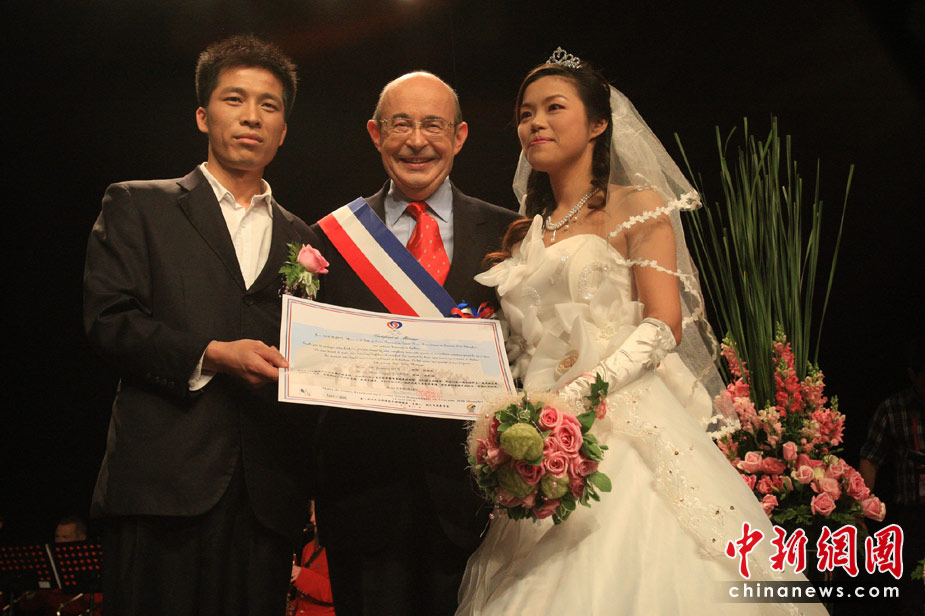 5月11日,35對(duì)新人來(lái)到世博法國(guó)館內(nèi)舉行婚禮儀式。法國(guó)館舉行“法蘭西浪漫婚典”的集體婚禮。圖為法國(guó)圖爾市長(zhǎng)為參與此婚典的新人頒發(fā)“證書(shū)”。中新社發(fā) 潘索菲 攝