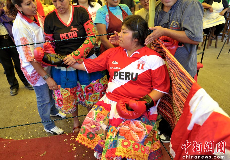 5月13日,秘魯利馬高地舉辦的傳統(tǒng)食品博覽會上,兩名安第斯農(nóng)民婦女穿著象征秘魯和玻利維亞的裙子同臺搏擊妙趣橫生。圖片來源:中國新聞網(wǎng)