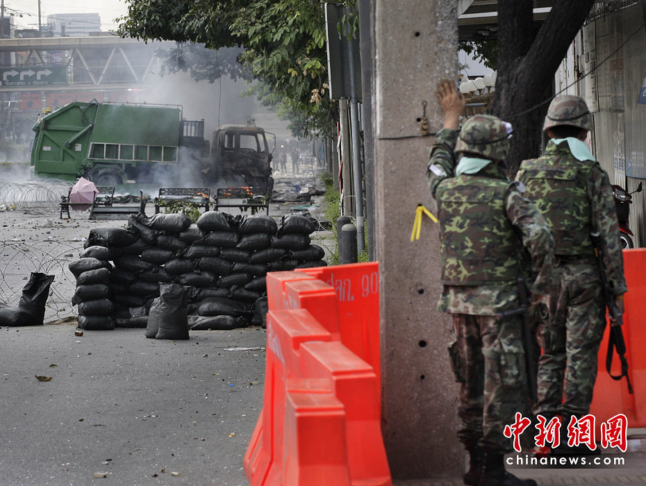 泰國政府軍和反政府示威者5月14日深夜在曼谷爆發(fā)嚴(yán)重暴力沖突。曼谷緊急醫(yī)療機(jī)構(gòu)15日稱,截止當(dāng)?shù)貢r間早晨6時,沖突已導(dǎo)致16人死亡,至少141受傷,傷者中包括3名外國人。圖片來源:中國新聞網(wǎng)