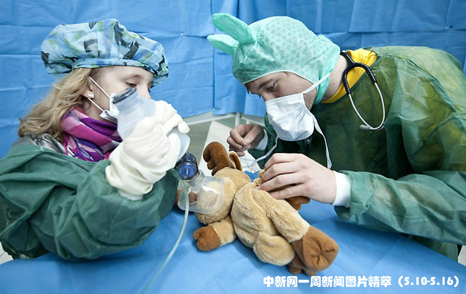 周一(10日),在德國柏林的菲爾紹臨床中心的“泰迪熊醫(yī)院”,萊奧尼(Leonie, 左)和一名醫(yī)科學生在為一個毛茸玩具動手術(shù)。這家醫(yī)院旨在減輕孩子們對醫(yī)生和醫(yī)療設備的恐懼感。
