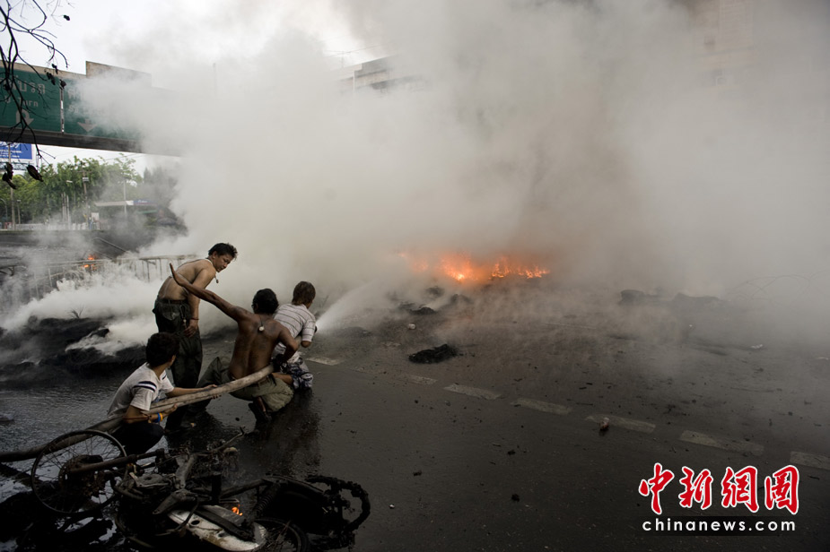泰國軍隊和反政府的“紅衫軍”16日繼續(xù)在曼谷的多處地點對峙,槍聲和爆炸聲不時響起,曼谷的部分街道已成為“戰(zhàn)區(qū)”。泰國急救醫(yī)療部門17日表示,泰國軍警與反政府“紅衫軍”示威民眾3天來在曼谷街頭爆發(fā)的沖突,死亡人數(shù)已經(jīng)上升到35人。圖片來源:中國新聞網(wǎng)