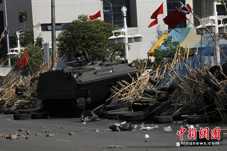 19日泰國軍方對聚集在首都曼谷市示威的反政府“紅衫軍”展開了驅(qū)散行動。軍方裝甲車已突破“紅衫軍”所筑路障,且至少有3人被槍擊中。圖片來源:中國新聞網(wǎng)