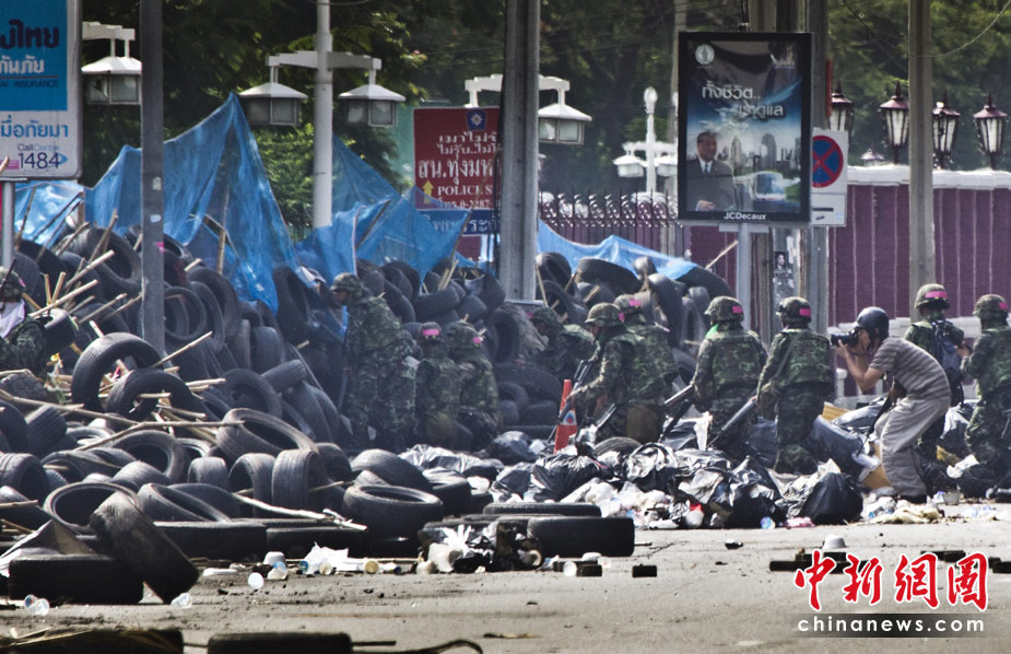 19日,發(fā)起驅(qū)散行動(dòng)的泰國(guó)軍方突破了反政府“紅衫軍”示威者在曼谷市中心所筑路障,進(jìn)入其營(yíng)地內(nèi),雙方爆發(fā)槍戰(zhàn)。目擊者稱,已有至少9人受傷,多數(shù)是被槍擊中。
