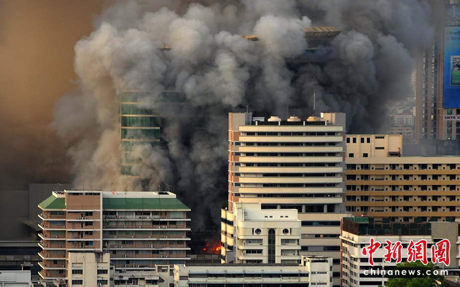 泰國軍方19日清場,希望將陷入內(nèi)戰(zhàn)邊緣的曼谷拯救出來,雖然紅衫軍節(jié)節(jié)敗退,但有激進分子未肯罷休,四處放火,電視臺、股票交易所、電力公司、幾間銀行、商場戲院都遭殃,商場和便利店亦成為搶掠目標(biāo)。據(jù)報曼谷有27處地方起火,泰國最大的商場Central World、Siam Square和Siam Paragon三大購物中心被縱火,其中Central World燒通頂,據(jù)報快將倒塌。