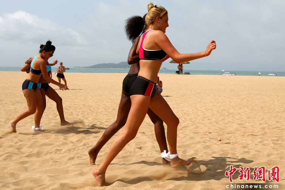 5月22日,一場沙灘趣味運動會在三亞海邊舉行,全球64位比基尼佳麗悉數(shù)登場,展現(xiàn)自己的運動天賦。中新社發(fā) 富田 攝