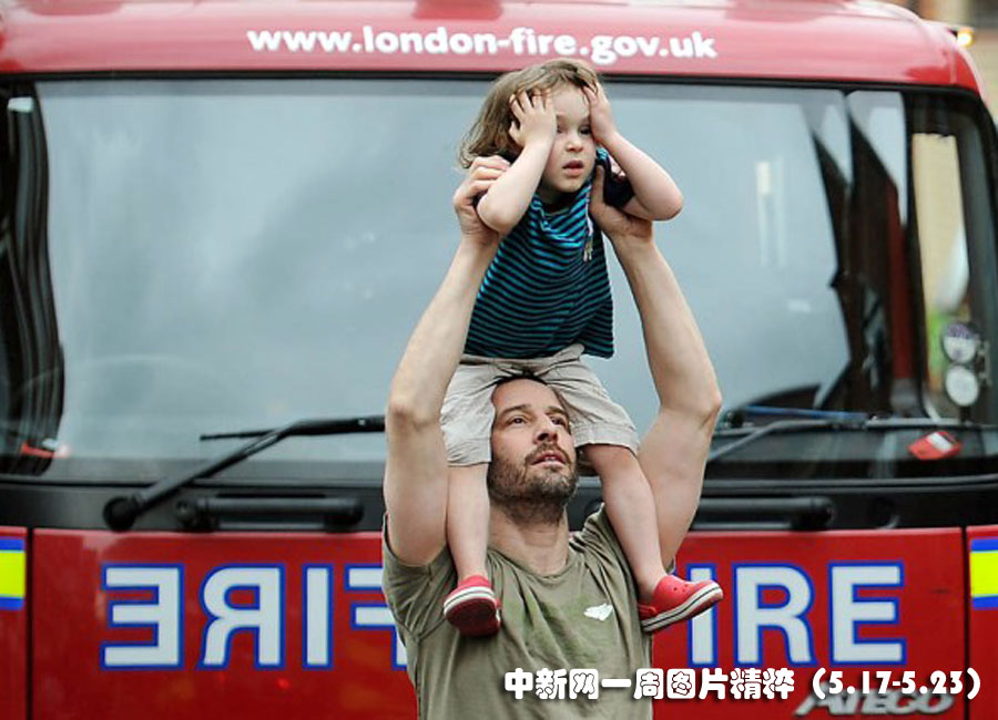 5月19日,一名男子托起小孩觀看消防隊(duì)員撲滅倫敦公寓屋頂?shù)拇蠡稹T摴?yán)重受損,但無人受傷。
