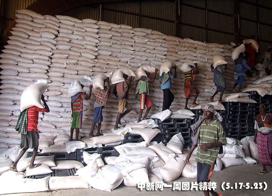 5月19日在索馬里摩加迪沙,工人們在一間倉庫內(nèi)搬運玉米。聯(lián)合國世界糧食計劃署的糧食供給將發(fā)放到那些貧困以及在國內(nèi)流離失所的人手中。
